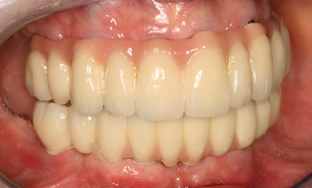 Over a period of two to four months, her mouth was fully healed mouth and dental implants were placed. A healing period of some 10 to 12 months was observed, during which time she was able to wear temporary teeth.