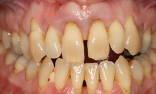 You can see how badly this lady’s gums were infected on the initial photograph. In addition to swollen gums she had a gap between the front teeth which had opened further in recent months and years. She suffered from a bad taste in her mouth and a persistently unpleasant odour. With treatment with the hygienist and surgical treatment from myself we were able to stabilise this, and achieve good healing in this lady’s mouth without extracting any teeth. Our work allowed the gums to fully heal as can be seen on the completion treatment. The patient’s gums have healed very healthily and her teeth have moved back into a good position, improving the appearance of the lady’s smile.