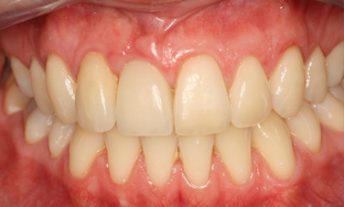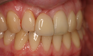 Our patient had a temporary bridge which can be seen on the ‘before’ photographs. This was very dark in appearance and frequently became detached, falling out at the most embarrassing moments. Her wish was for fixed teeth which looked and felt natural. We were able to place a single dental implant, also re-contouring the gums so that the overall appearance was very natural.